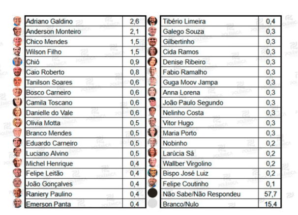 O levantamento, realizado entre os dias 6 e 9 de julho, ouviu 2 mil eleitores paraibanos, com margem de erro de 3% e nível de confiança de 95%. Conforme os dados apresentados, Camila Toscano ocupa a 9ª colocação na preferência do eleitorado para a Assembleia Legislativa da Paraíba (ALPB).