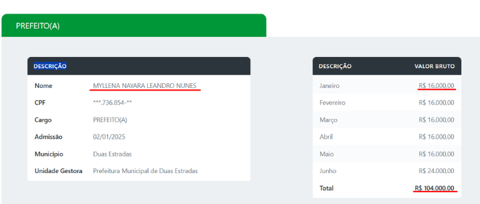 Apesar de ter à disposição carro oficial com combustível custeado pela Prefeitura, a prefeita de Duas Estradas, Myllena Nayara, registrou entre janeiro e agosto R$ 13 mil em diárias, além do salário mensal de R$ 16 mil — totalizando R$ 104 mil, apenas nos seis primeiros meses de 2025.