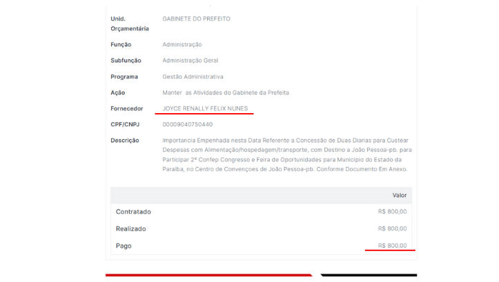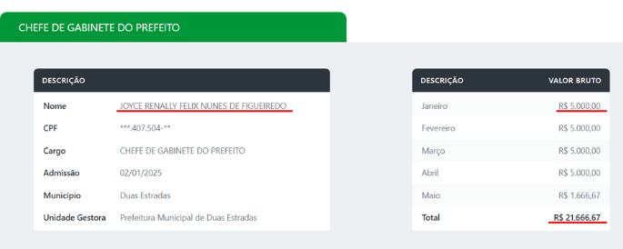 Os gastos não se limitam à gestora. Enquanto esteve na chefia de gabinete, a ex-prefeita Joyce Renally, com salário de R$ 5 mil, recebeu de janeiro a maio R$ 21.666,67, além de R$ 4.400,00 em diárias de janeiro a abril.