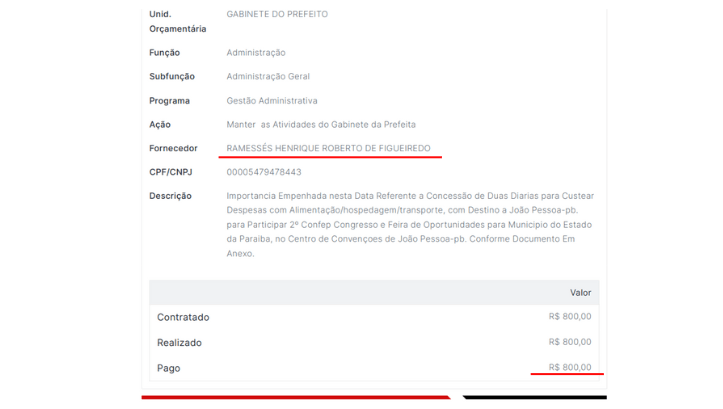 O Controlador-Geral do Município, Ramessés — esposo de Joyce, também com salário de R$ 5 mil, recebeu de janeiro a junho R$ 32.500,00 e, de janeiro a agosto, R$ 7.400,00 em diárias.