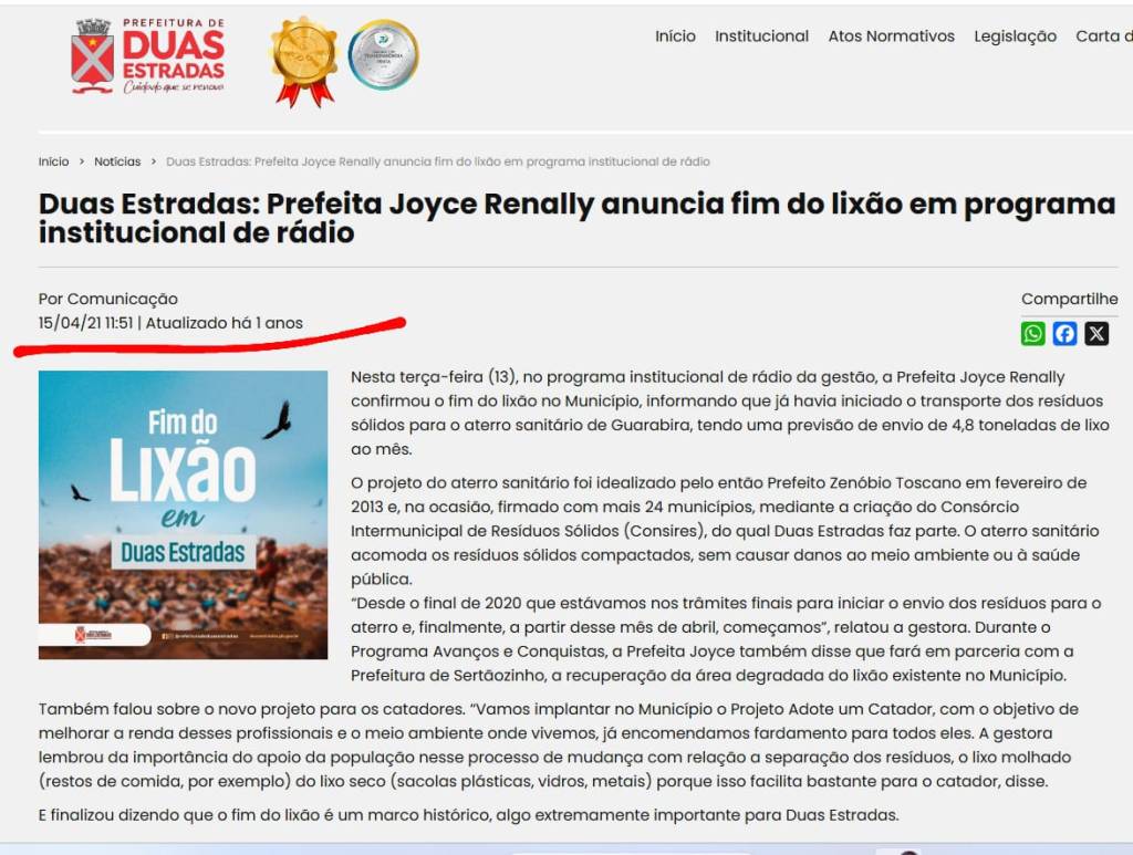 Em 2021, a então prefeita Joyce Renally anunciou oficialmente o encerramento do lixão no município de Duas Estradas, informando que os resíduos passariam a ter destinação adequada. A eventual divergência entre o anúncio institucional e a situação atualmente denunciada poderá ser analisada pelos órgãos de controle.