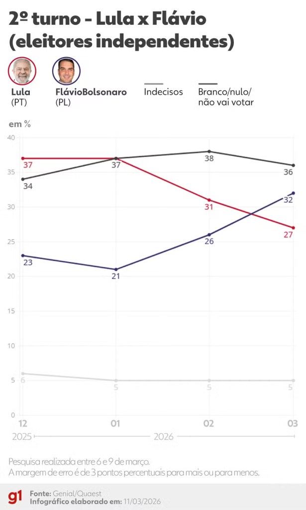 Entre os eleitores que se consideram independentes — aqueles que não se declaram nem de direita, nem de esquerda, nem lulistas, nem bolsonaristas —, Flávio aparece numericamente à frente de Lula pela primeira vez, com 32%. O presidente tem 27%, e outros 36% afirmam que preferem não votar nesse cenário.