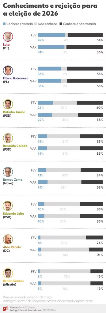 - Lula: 41% (eram 43% em fevereiro e 45% em janeiro);
